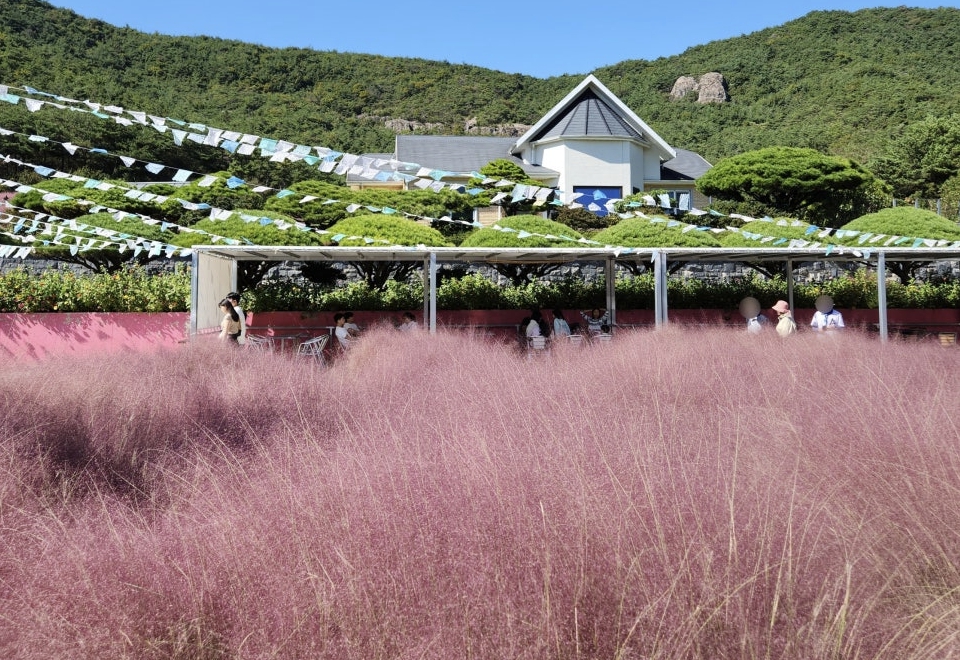 핑크뮬리뿐 아니라 구절초, 코스모스 등 다양한 가을 꽃이 함께 피며, 정원 곳곳에 설치된 포토존에서 감성 사진을 남기기 좋습니다.